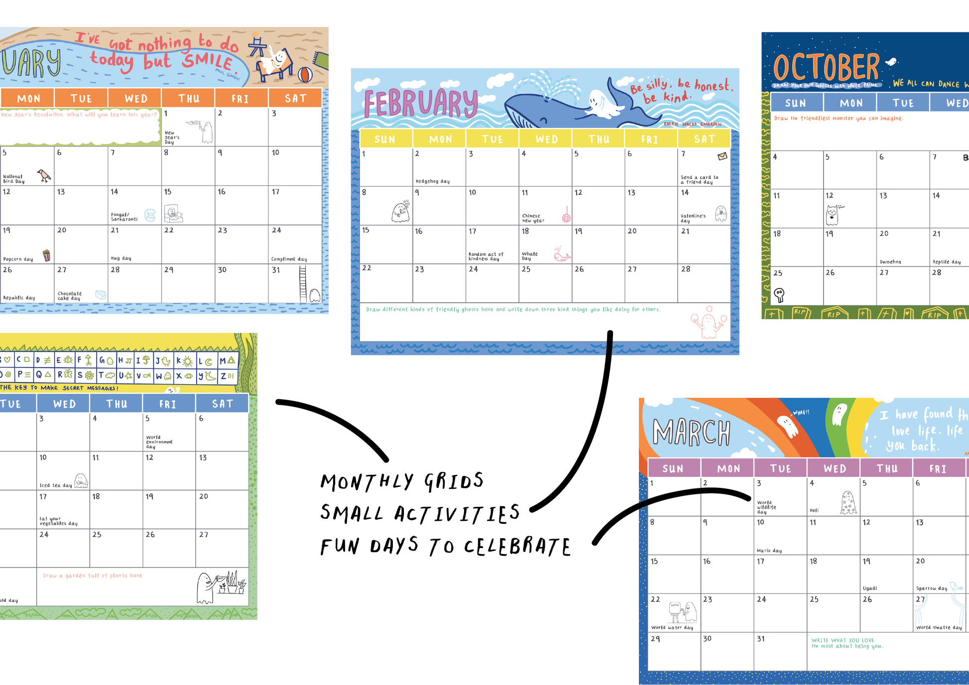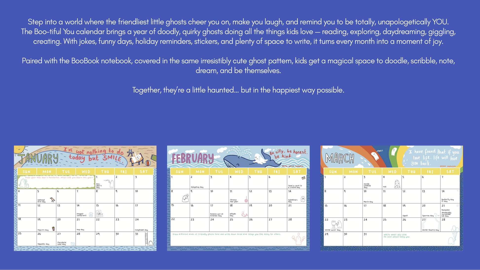 The 2026 Boo Crew calendar brings a year of doodly, quirky ghosts doing all the things kids love — reading, exploring, daydreaming, giggling, creating. With jokes, funny days, holiday reminders, stickers, and plenty of space to write, it turns every month into a moment of joy.